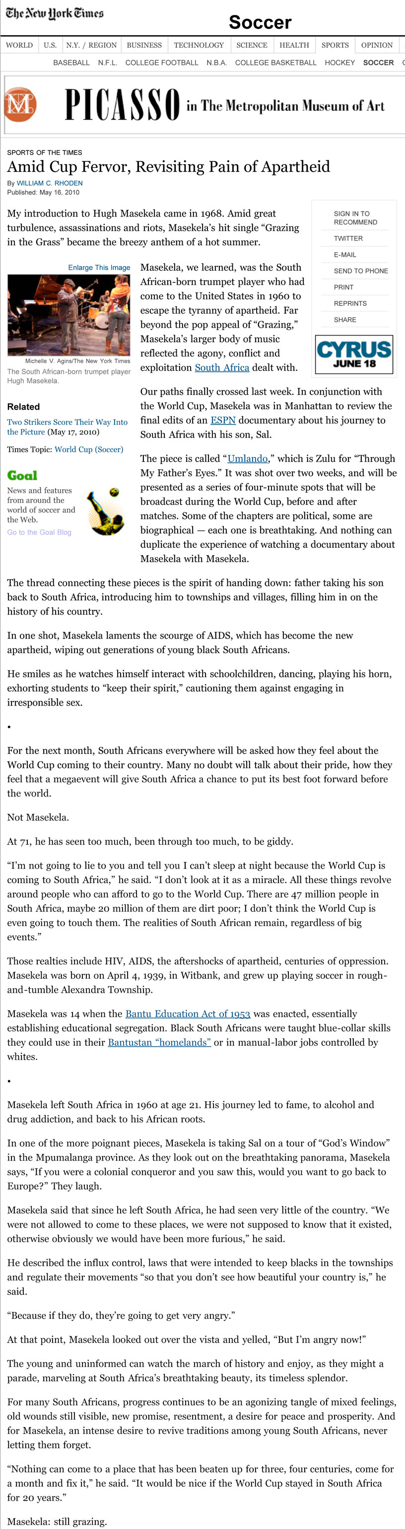 On the eve of soccer's World Cup 2010, Hugh Masekela, one of South Africa's greatest musicians and activists, leads his American son Sal around the country to all the areas that will be hosting games.
